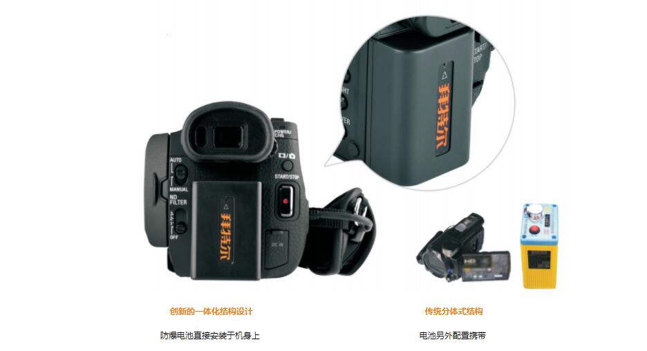 創(chuàng) 新的一體化設(shè)計(jì),本安鋰電池直接安裝于攝像機(jī)機(jī)身上,整體重量(含電池)約870g,便于使用、攜帶。